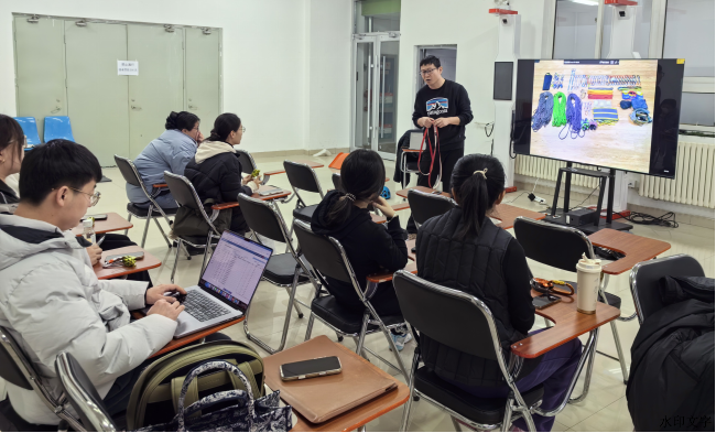 上午培训以攀岩基础知识讲解为主,孟健老师凭借丰富的行业经验与专业资质,将复杂的理论内容讲解得通俗易懂。课程开篇,孟老师从攀岩装备切入,详细介绍了攀岩装备的分类体系,重点聚焦安全防护类装备展开深度讲解。针对安全带、头盔、锁扣等核心装备,孟老师不仅清晰阐释了其设计原理与选型标准,还通过现场演示的方式,逐一拆解了装备的正确穿戴、佩戴方法及检查要点,强调“装备安全是攀岩运动的第一道防线”,要求每位参训老师务必掌握装备安全检查的关键流程。