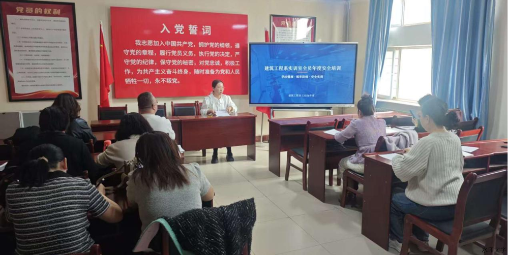为全面落实学院安全管理要求,切实提升实训室安全意识与应急处置能力,规范实训操作行为,防范化解各类安全风险,3月11日,建筑工程系组织开展 2026 年度新学期第一次实训室全员安全培训。本次培训由建筑工程系党总支书记、主任史增录主持,刘晓老师担任主讲人,建筑工程系全体教师参与。